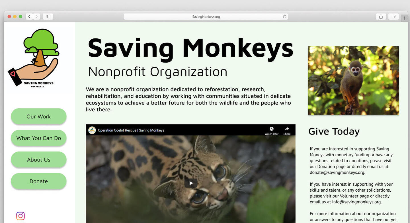 To capture the essence of Saving Monkeys' mission and values, I embarked on an iterative logo design process. Through thorough research and concept exploration, I crafted a series of logo options that conveyed the organization's dedication to wildlife conservation and primate protection. Collaborating closely with the client, we refined the logo design to create a visually engaging and memorable emblem that represented the core identity of Saving Monkeys.Website Redesign Mock-up: